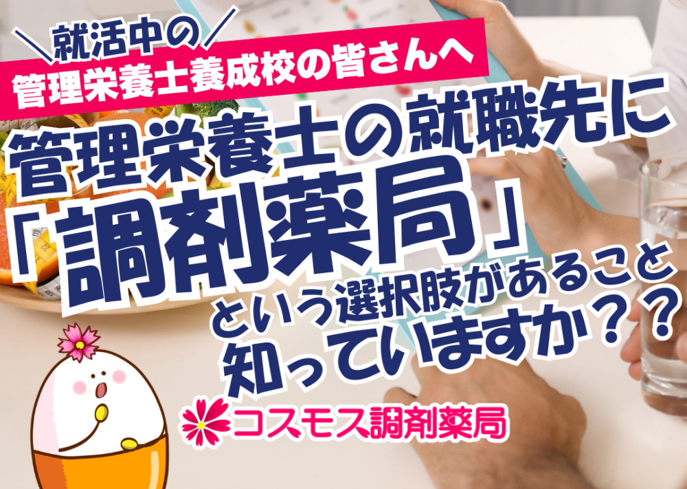 WHAT'S NEW最新情報 取り組み紹介 2026/3/6 【👩🍳調剤薬局という就活先!就職活動中の管理栄養士の皆さんへ 株式会社コスモス調剤👩🍳】 ...続きを見る 採用関連 2026/2/27 🌷【後編|キャリアチェンジ編】“やってみたい”をカタチにした人|調剤事務から広報担当へ、新しい挑戦 ...続きを見る 採用関連 2026/2/26 🌷【前編|就活・入社編】“やってみたい”をカタチにした人|調剤事務としてのスタートと成長 ...続きを見る 採用関連 2026/2/26 【💡就活をもっと効率的に】就活生必見|株式会社コスモス調剤 公式サイトに検索機能を追加!企業説明会も受付中 ...続きを見る 取り組み紹介 2026/2/24 【🎉地域とつながる薬局へ――コスモス調剤薬局の地域密着イベント「こども薬局」を知立市の中山店にて開催しました!💊】 ...続きを見る 取り組み紹介 2026/2/20 【👹🫘2月 旬の食材 “ほうれんそう”を楽しもう!食材カレンダー&管理栄養士の豆知識付き💡】 ...続きを見る