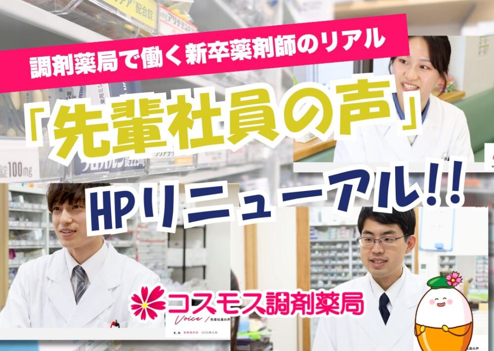 WHAT'S NEW最新情報 取り組み紹介 2026/1/7 【🎍1月 旬の食材 “白菜”を楽しもう!食材カレンダー&管理栄養士の豆知識付き💡】 ...続きを見る 採用関連 2026/1/5 【👩🍳薬局管理栄養士の新たな取り組み紹介!在宅栄養指導レポート👩🍳】 ...続きを見る その他 2026/1/1 【🎍 新年のご挨拶 |地域とともに、患者さまに寄り添う一年へ】 ...続きを見る 取り組み紹介 2025/12/24 【💊 薬剤師&調剤事務の「イベント企画」研修+コスモス調剤が企画した地域イベント紹介!💊】 ...続きを見る 取り組み紹介 2025/12/19 【🏃社内サークル紹介│コスモス調剤薬局の”サークル活動”を一気にご紹介!🎉】 ...続きを見る 採用関連 2025/12/10 【💊就活生必見 !! 薬剤師&調剤事務の「振り返り・目標設定」研修をレポート!💊】 ...続きを見る