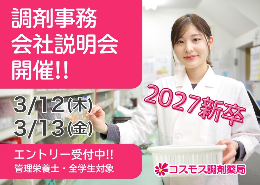 トップページ ブログ一覧 お知らせ 採用関連 【🌷2027新卒|調剤事務🌷】会社説明会を開催いたします!|株式会社コスモス調剤(愛知県)