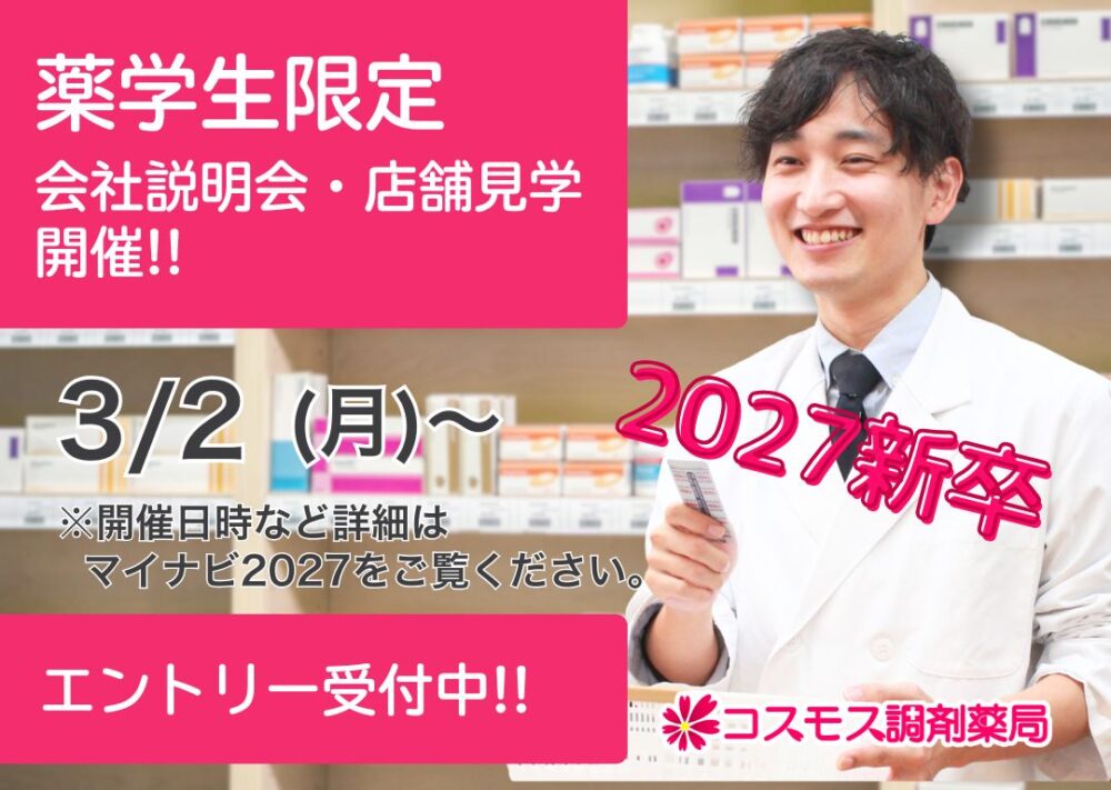 トップページ ブログ一覧 お知らせ 採用関連 【💊2027年卒 薬学生向け💊】3月1日、就活解禁!調剤薬局の店舗見学・会社説明会受付中!|コスモス調剤(愛知県)