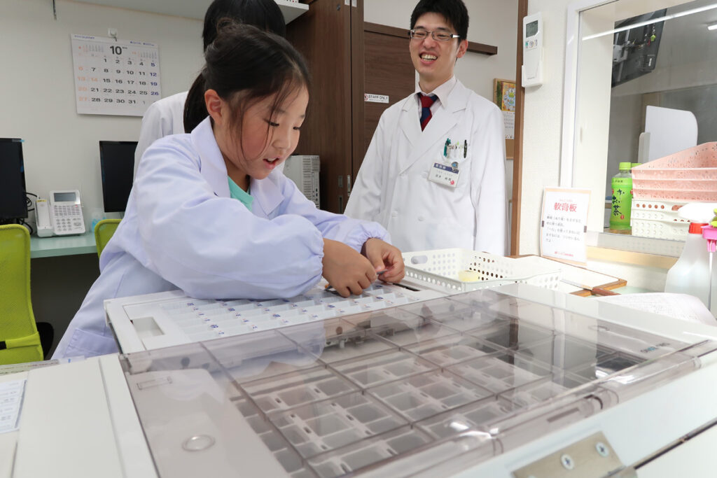 本物の「分包機」で薬(お菓子)を袋詰めしたり・・・