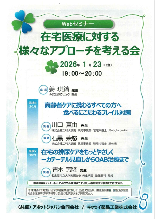 後半の講座では、共催先の病院にご所属の教授より、在宅医療における排尿ケアやカテーテル管理など、より専門性の高いテーマをお話しいただきました。