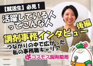 皆さんこんにちは! 愛知県に約50店舗を展開する、株式会社コスモス調剤の広報担当Iです😊🌼 前編に引き続き、私と同じ部署で働く調剤事務経験のある先輩にインタビュー! ぜひご覧ください!👀✨ & … 続きを読む 🌷【後編|キャリアアップ編】活躍している人ってこんな人|つながりの中で広がった私の事務職キャリア